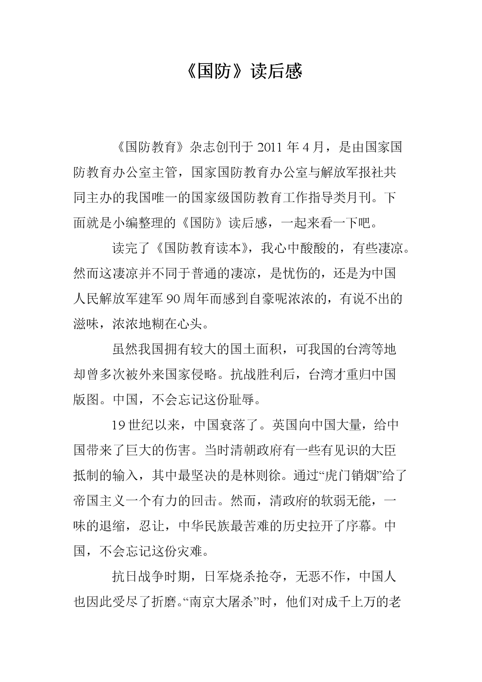 我深刻体会到国防建设需要全社会的共同参与,我们要加强国防教育,提高全民的国防意识,形成全社会共同参与国防建设的良好氛围。